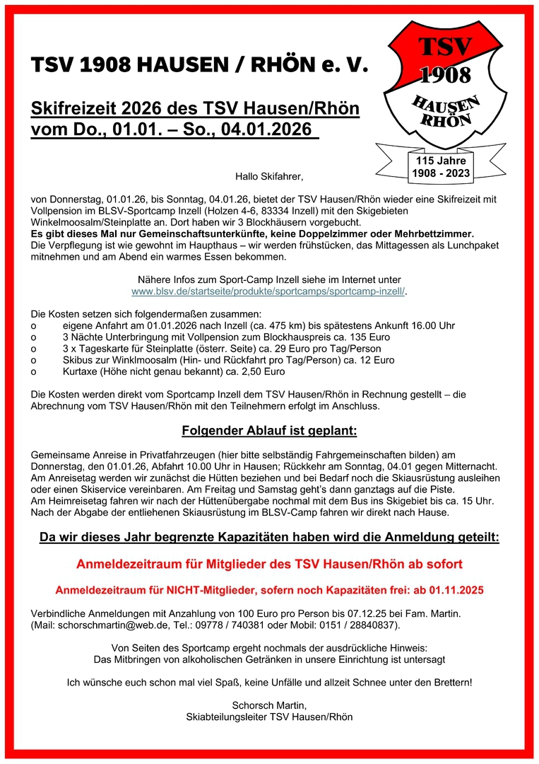 Erfolgreicher Auftakt ins (Sport-)Jahr 2024: Vom 03. bis 07. Januar hatte der TSV Hausen wieder eine Ski-Freizeit im BLSV-Sportcamp Inzell mit den Skigebieten Winkelmoosalm/Steinplatte angeboten. 29 Teilnehmer waren dabei und hatten beim Skifahren, aber auch beim Rahmenprogramm (u. a. Eisstockschießen und Schlittschuhlaufen), viel Spaß!