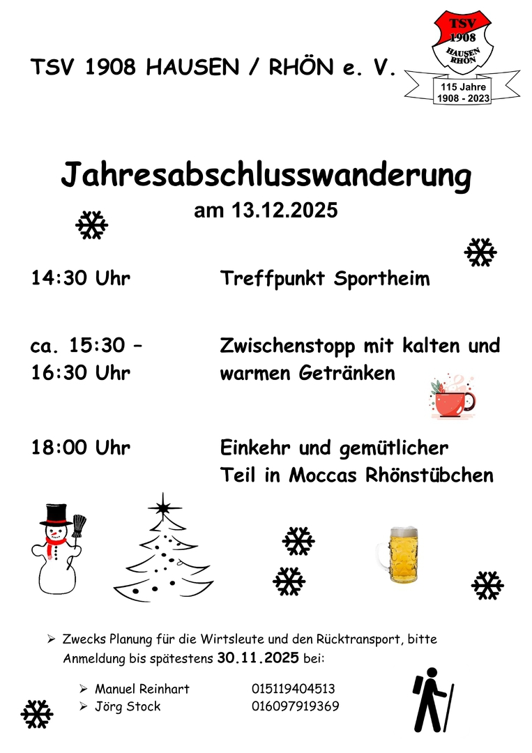 | Samstag, 13. Dezember | TSV-Jahresabschlusswanderung |